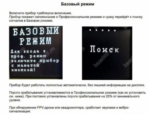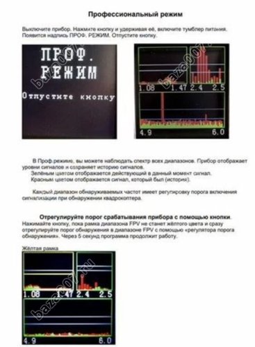 Изделие может работать в двух режимах: Базовый и Профессиональный. В Профессиональном режиме изделие является 3-х диапазонным анализатором спектра. В Базовом режиме, прибор будет работать полностью автоматически, без лишней информации на дисплее.